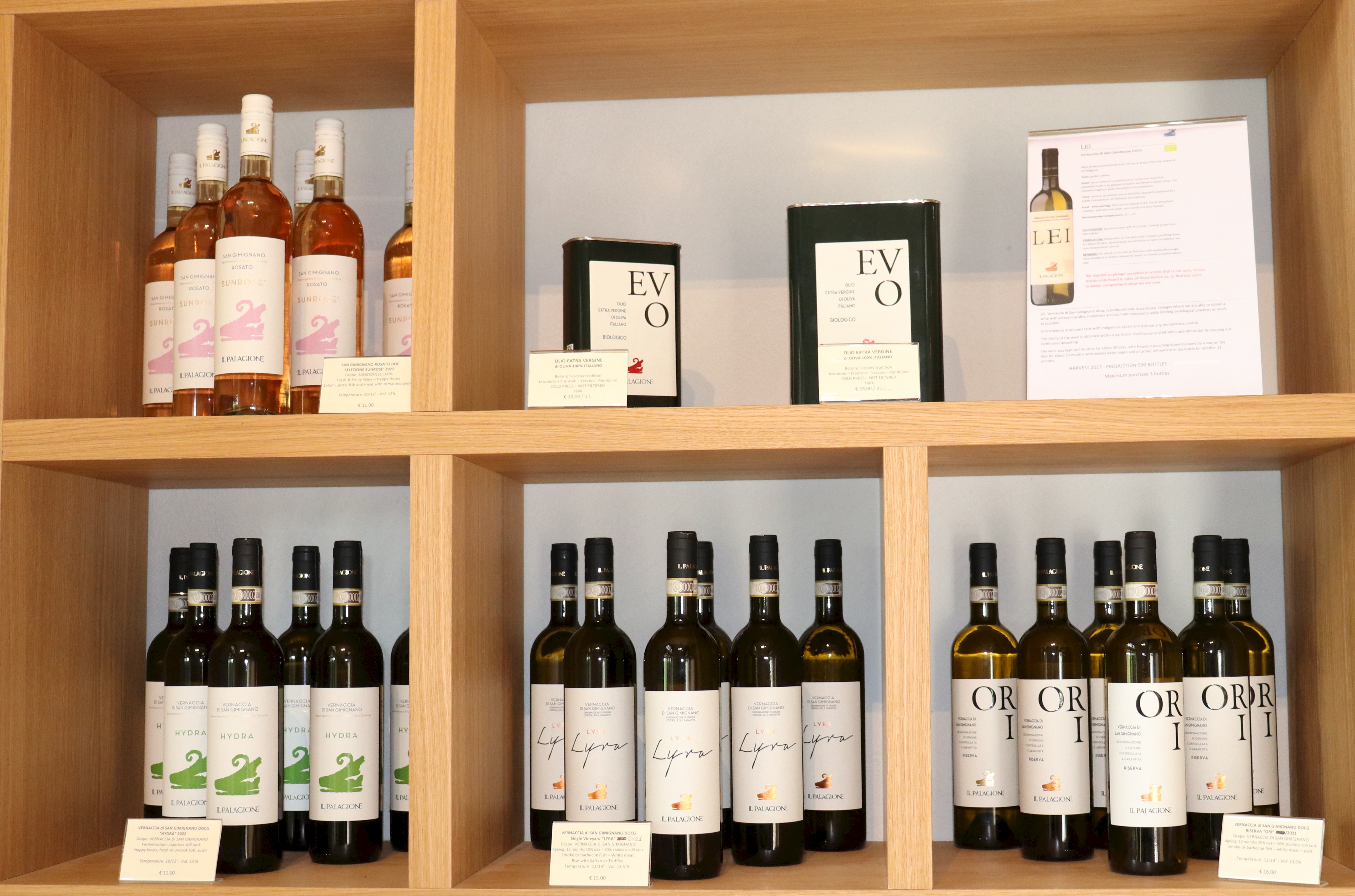 Dominanciou tohto vinárstva je organická produkcia vína – Vernaccia di San Gimignano a Chianti dei Colli Senesi. S Giorgiom postupne ochutnávam všetky varianty bielej odrody Vernaccia. Začíname so sviežim a delikátnym vínom Hydra DOCG, ktoré pre svoju vyváženú chuť a ovocné tóny je skvelým aperitívom či doplnkom k ľahkým jedlám, pokračujeme s minerálnejšou a bohatšou Lyrou DOCG a prehliadku Vernaccie ukončuje ORI Riserva DOCG, ktorá je plná, elegantná s vôňou vanilky, sušeného ovocia, šafránu... Biele víno striedajú varianty Chianti Colli Senesi s názvom Caelum DOCG a Draco Riserva DOCG, ktoré je vyrobené z modrej odrody Sangiovese, ktoré ponúkajú elegantnosť, sviežosť a jedinečnú vyváženosť...